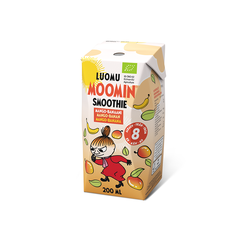 Introducing Moomin Organic Smoothie Mango Banana 2 dl, Little My’s favorite snack drink! Made with 70% organic fruit (45% mango and 25% banana), this vegan delight is a natural, no-sugar-added treat perfect for on-the-go adventures. With just 47 kcal per 100g and 1g of fiber, it’s a healthy and convenient choice. Store unopened packs at room temperature and, once opened, refrigerate for up to 3 days. Experience the pure taste of organic fruits with Moomin Organic Smoothie Mango Banana!