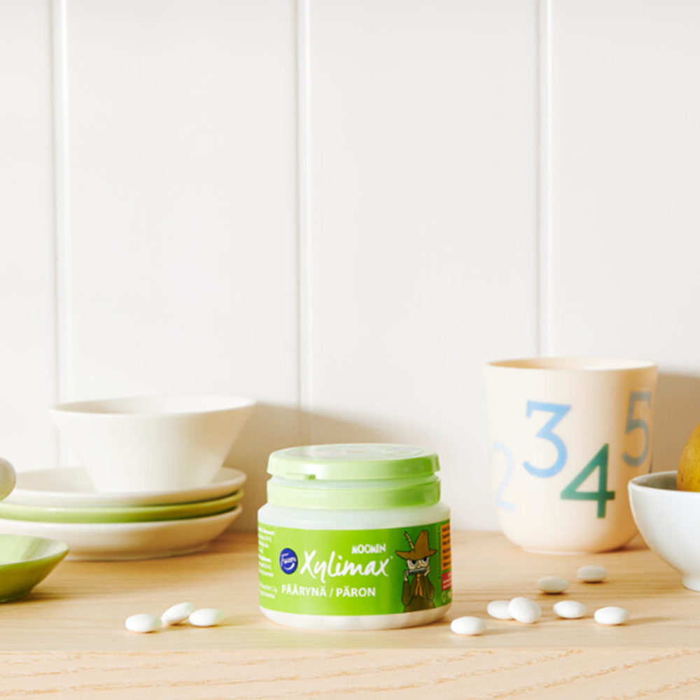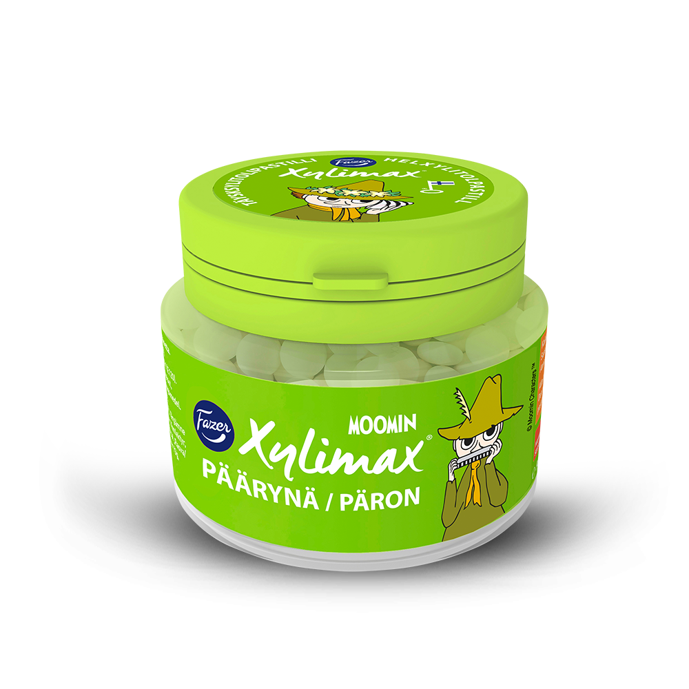 Finnish-made Xylimax Moomin full-xylitol pastilles are firm favourites for families with children. The gentle, fruity taste of Moomin pear pastilles brings to mind the Moomins’ fruit orchard. The pastilles are sweetened with Fazer’s Finnish oat xylitol and are gelatine-free. The resealable, super-sized container is easy to take along on adventures large and small.